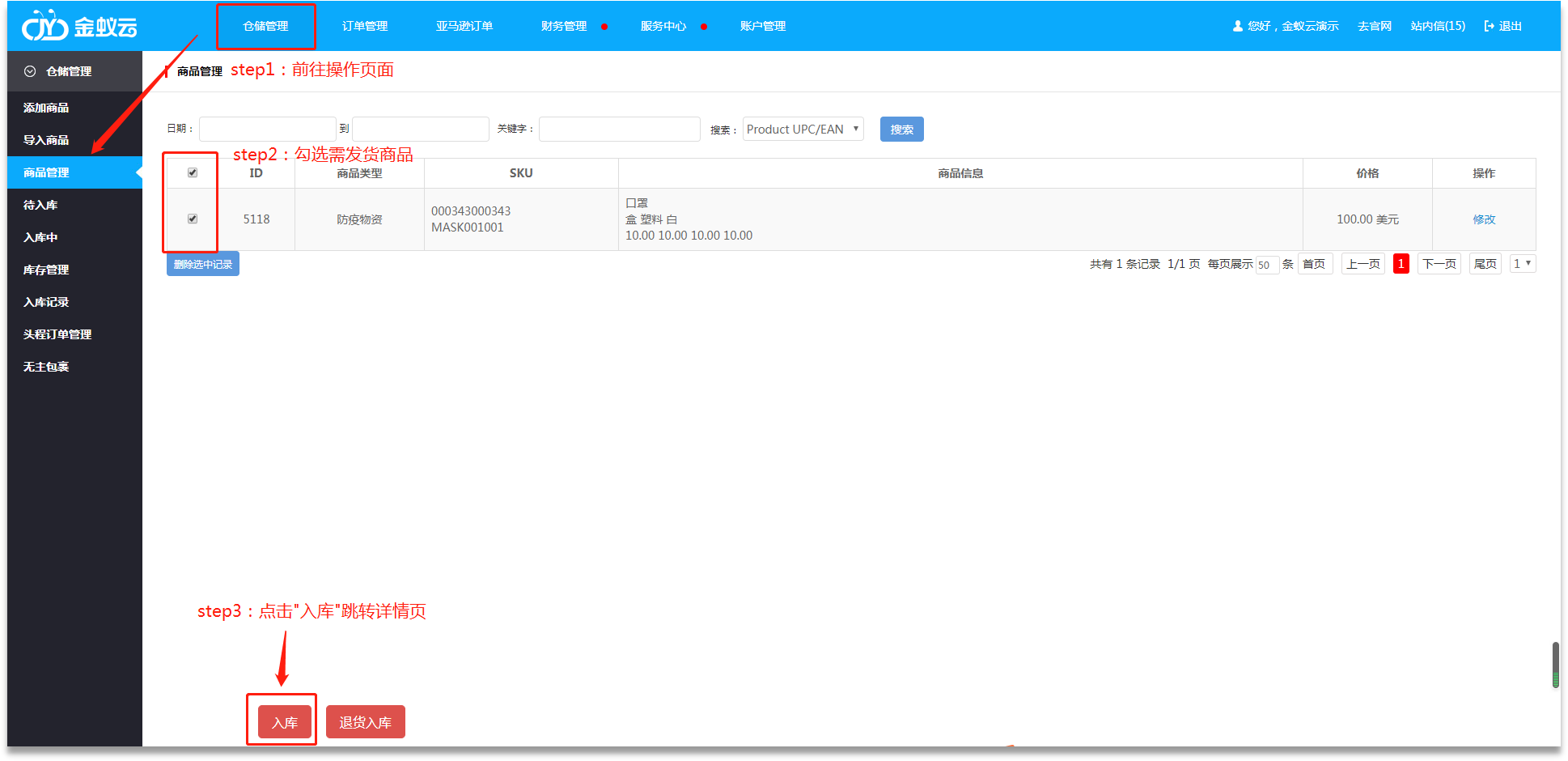 ·本系統支持頭程服務,用戶可前往【倉儲管理】-【商品管理】,勾選商品后點擊【入庫】,跳轉【入庫操作】頁面。