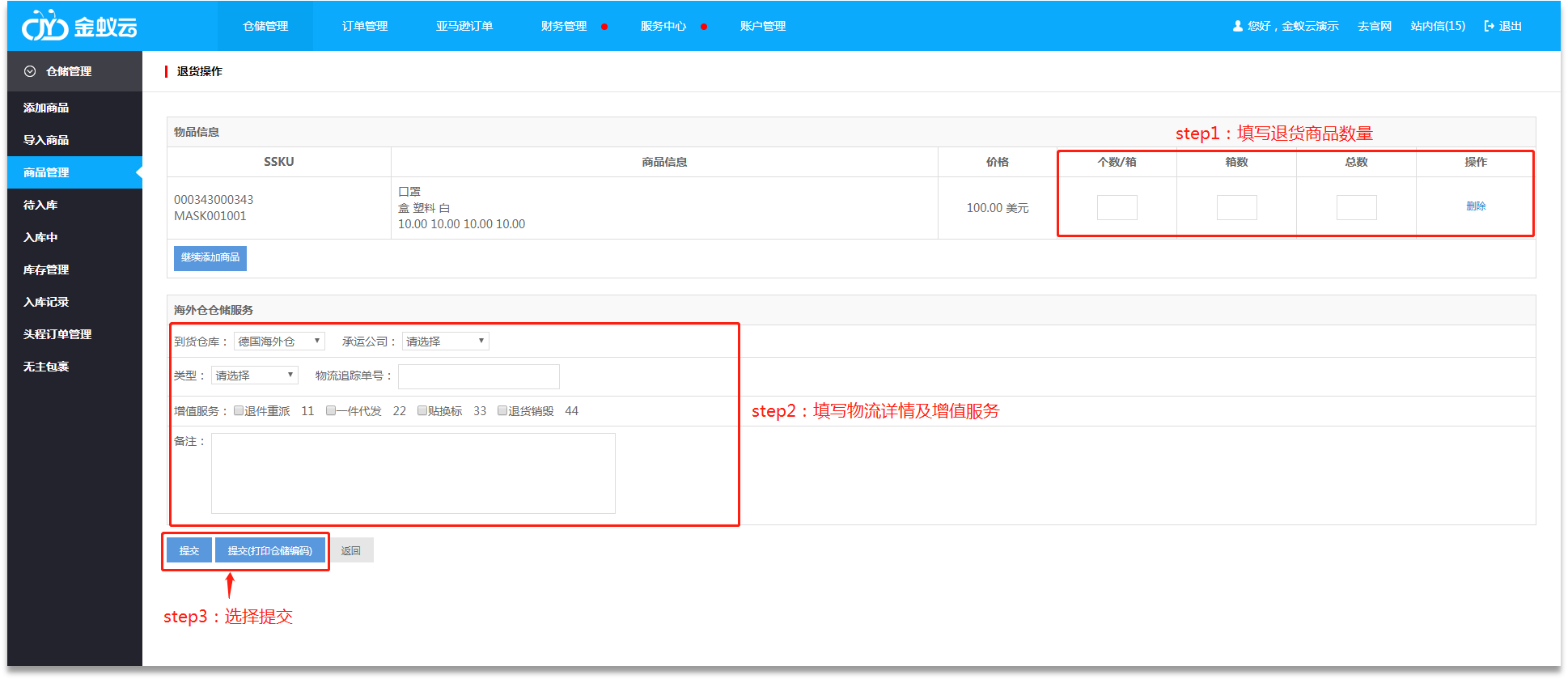 ·跳轉【退貨操作】后,填寫退貨商品的每箱個數、箱數,系統自動計算“商品總數”;勾選“海外倉儲服務”,填寫選擇倉庫、承運物流公司、類型、物流追蹤單號等,填寫完畢,即可點擊【提交】/【提交(打印倉儲編碼)】。
