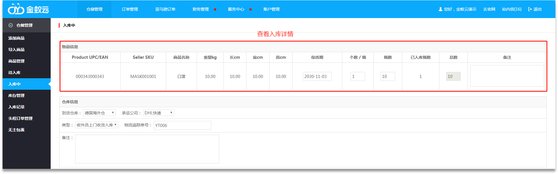 ·用戶查看具體入庫(kù)詳情,可在【倉(cāng)儲(chǔ)管理】-【入庫(kù)中】點(diǎn)擊【查看】,跳轉(zhuǎn)入庫(kù)詳情頁。