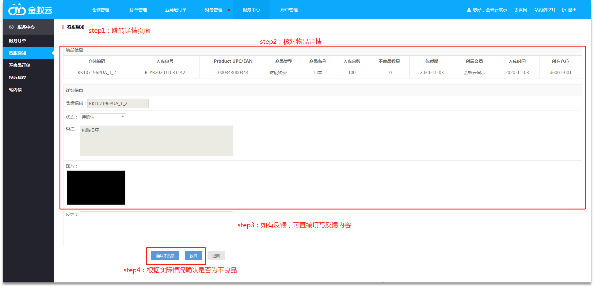 ·用戶點擊【確認不良品】后,需前往【倉儲管理】-【庫存管理】頁面提交不良品訂單。