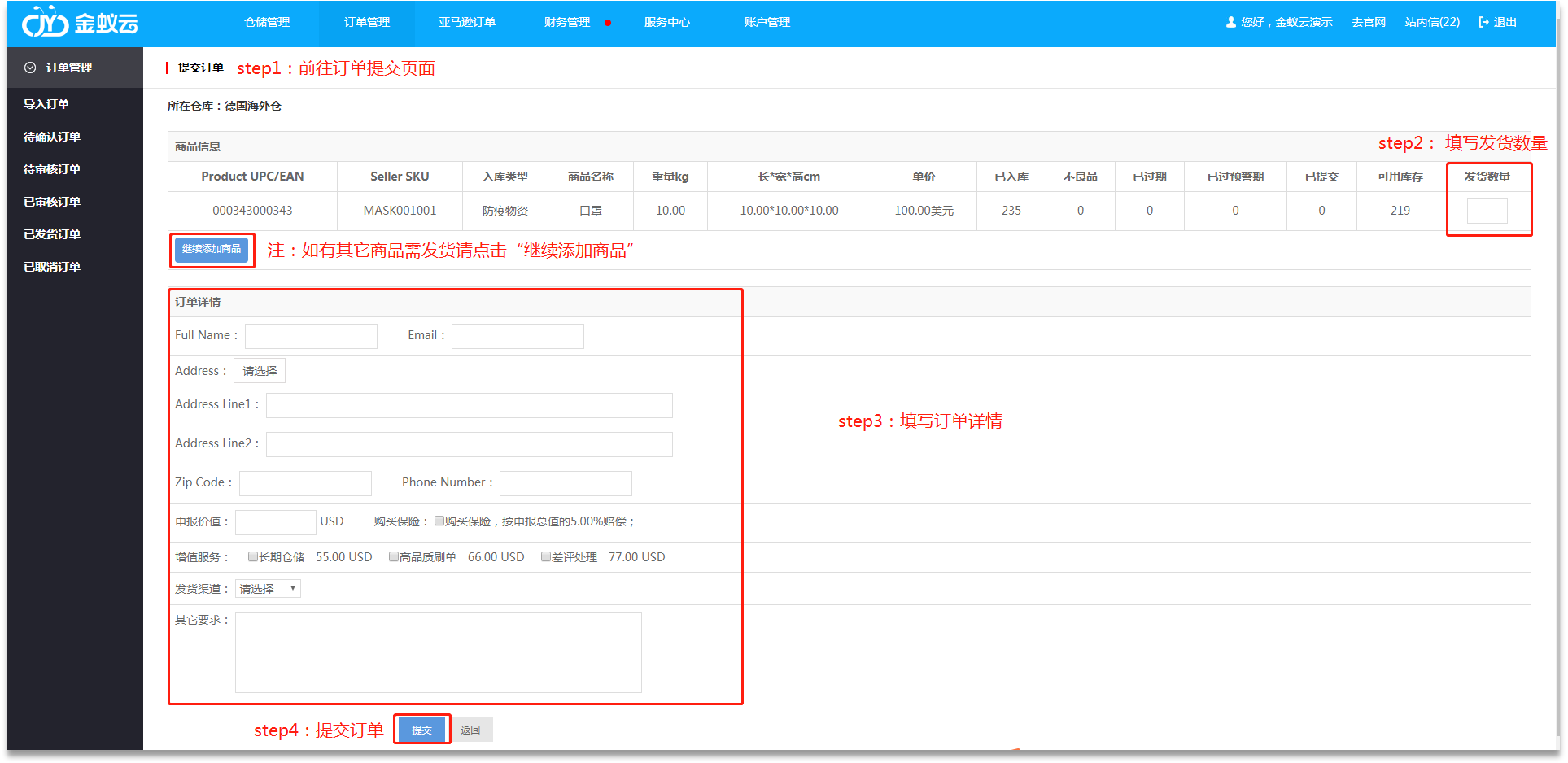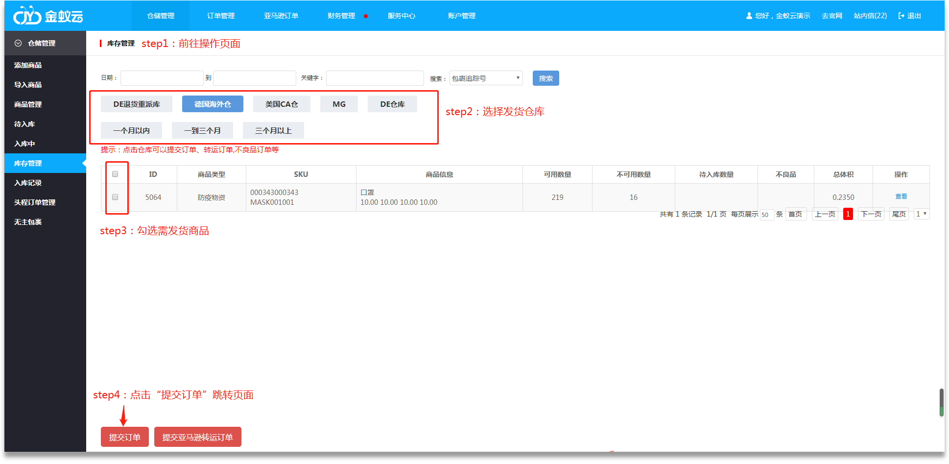 1.前往【倉儲管理】-【庫存管理】選擇對應(yīng)倉庫,勾選需出庫商品,點擊【提交訂單】跳轉(zhuǎn)【訂單管理】-【提交訂單】頁面,逐個提交。