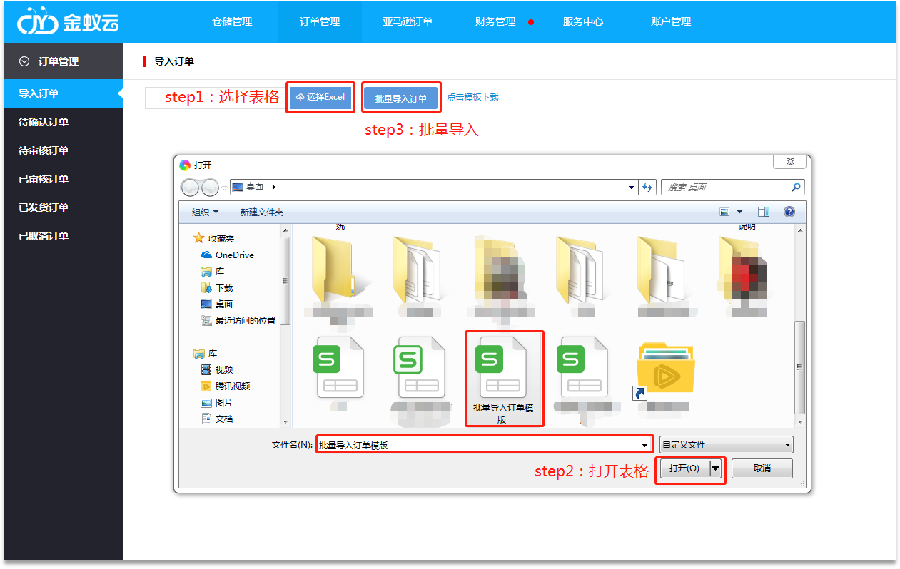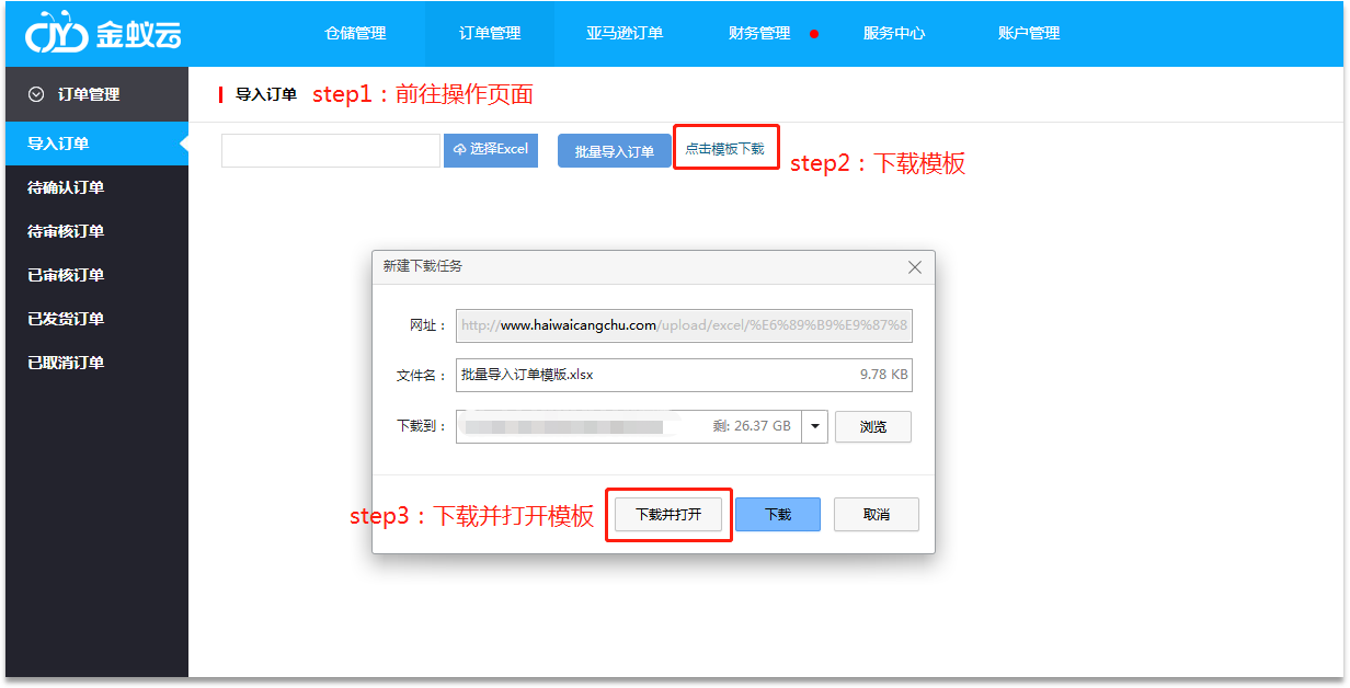 2.用戶前往【訂單管理】-【導(dǎo)入訂單】下載模板表格,填寫完畢后上傳表格,批量導(dǎo)入訂單信息。