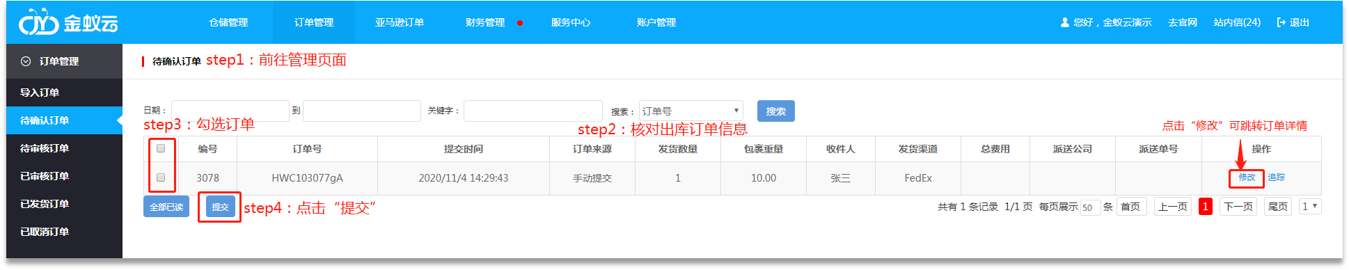 ·出庫訂單提交后,會直接轉(zhuǎn)入【訂單管理】-【待確認訂單】,用戶確定無誤后,可這直接勾選訂單,點擊【提交】。