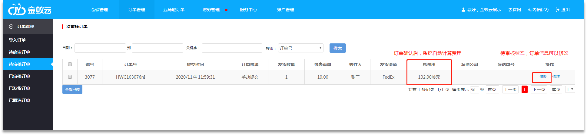 ·訂單確認后,轉(zhuǎn)入【訂單管理】-【待審核訂單】,在待審核狀態(tài),用戶可以查看/修改訂單。