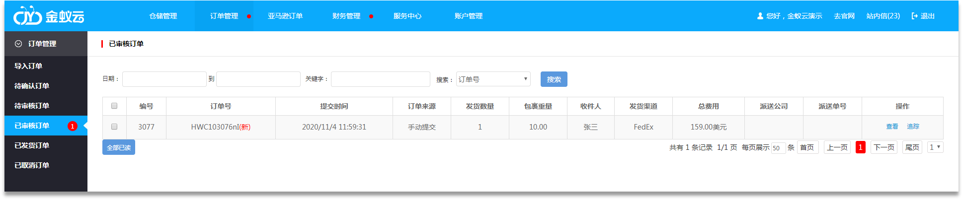 ·管理員審核通過后,訂單轉(zhuǎn)入【訂單管理】-【已審核訂單】,等待發(fā)貨。