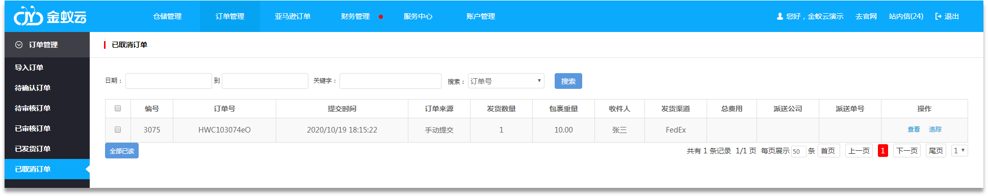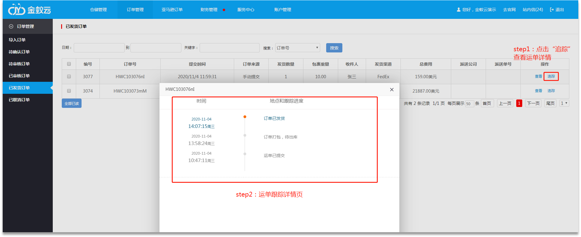 ·出庫訂單提交后,點擊操作欄的【追蹤】即可查看商品出庫的進度及物流信息。