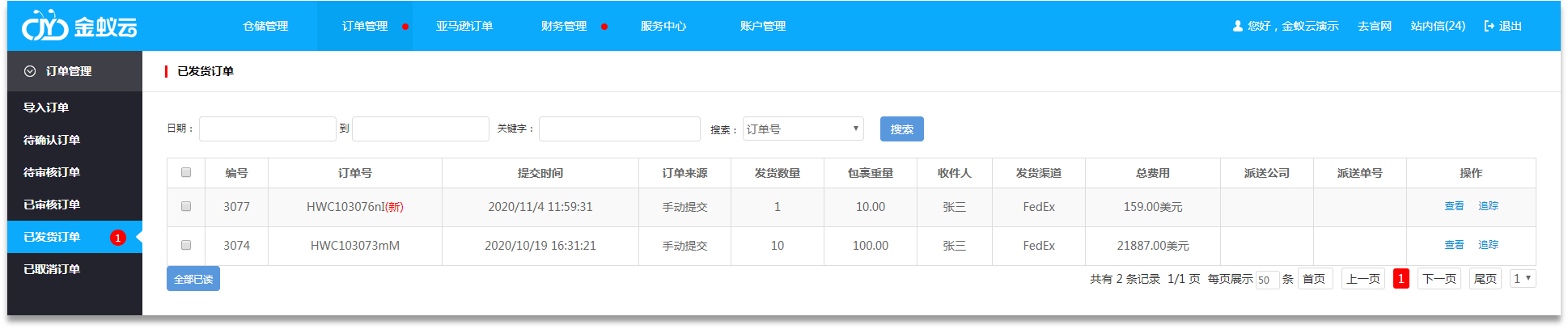 ·倉庫發(fā)貨后,訂單轉(zhuǎn)入【訂單管理】-【已發(fā)貨訂單】,用戶可在此查看訂單詳情。