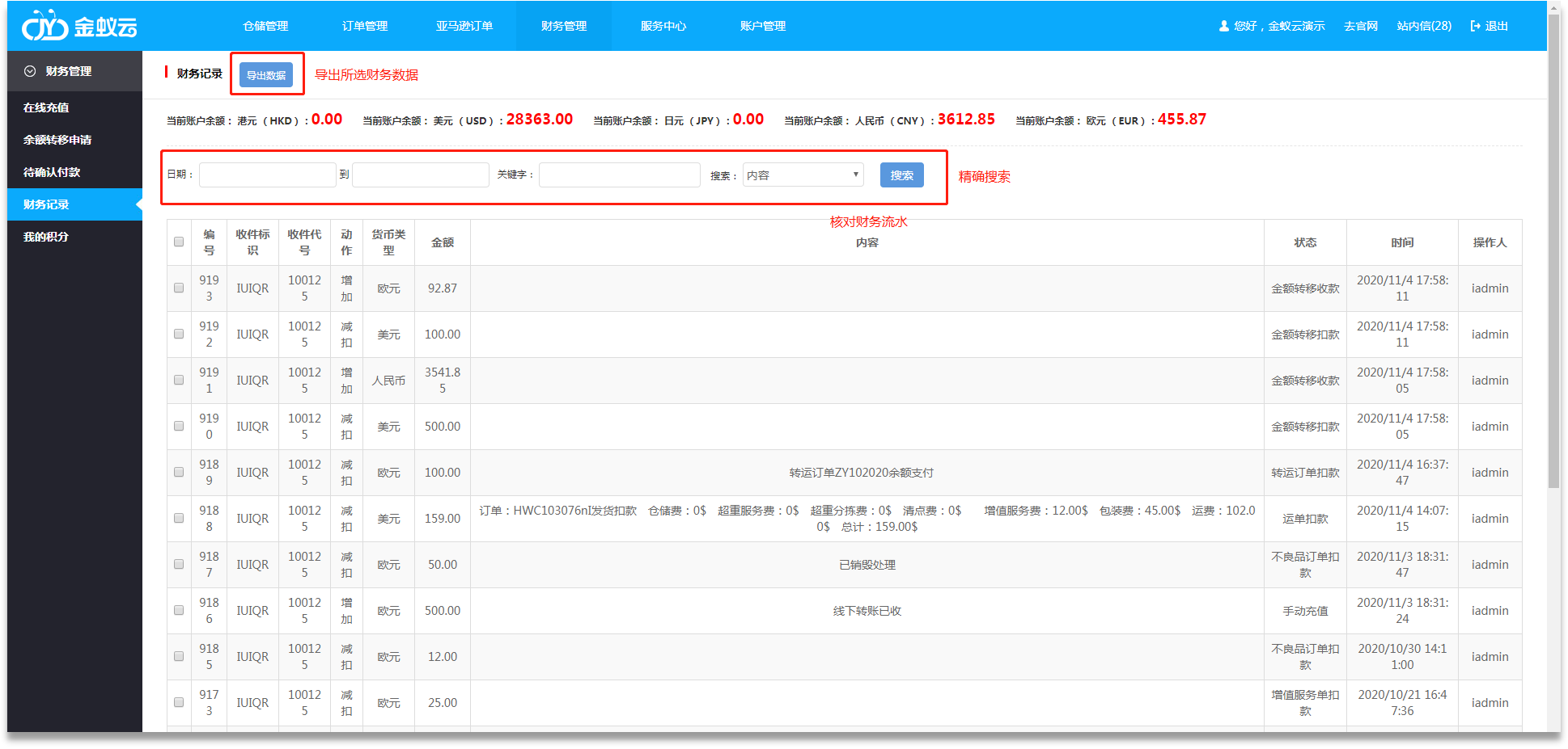 ·本系統嚴格記錄每一筆財務流水,用戶可前往【財務管理】-【財務記錄】中查詢并導出財務數據。