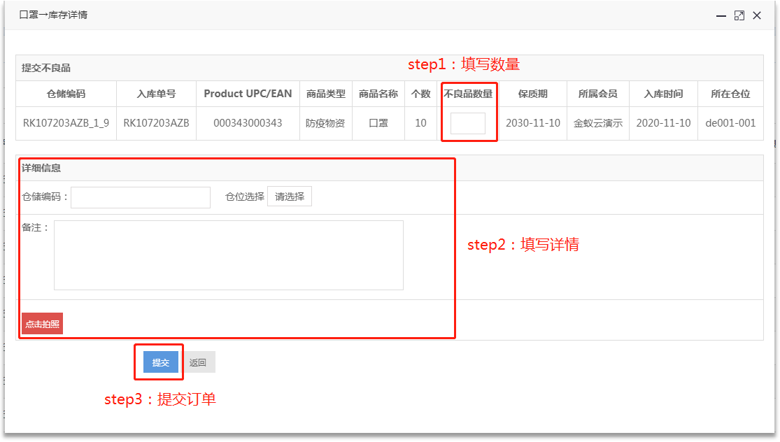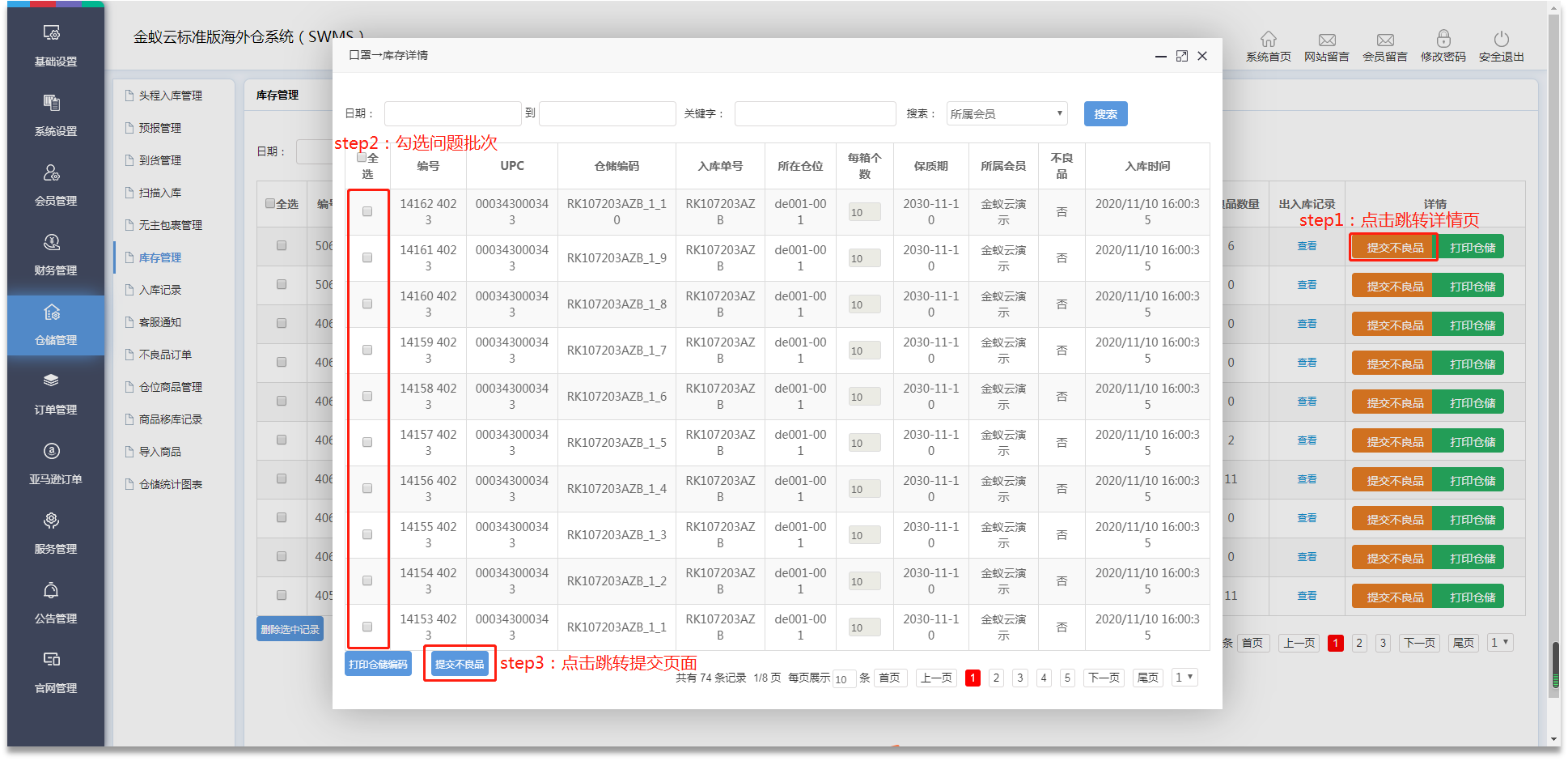 ·如發現不良品,管理員需在【倉儲管理】-【庫存管理】提交不良品訂單。