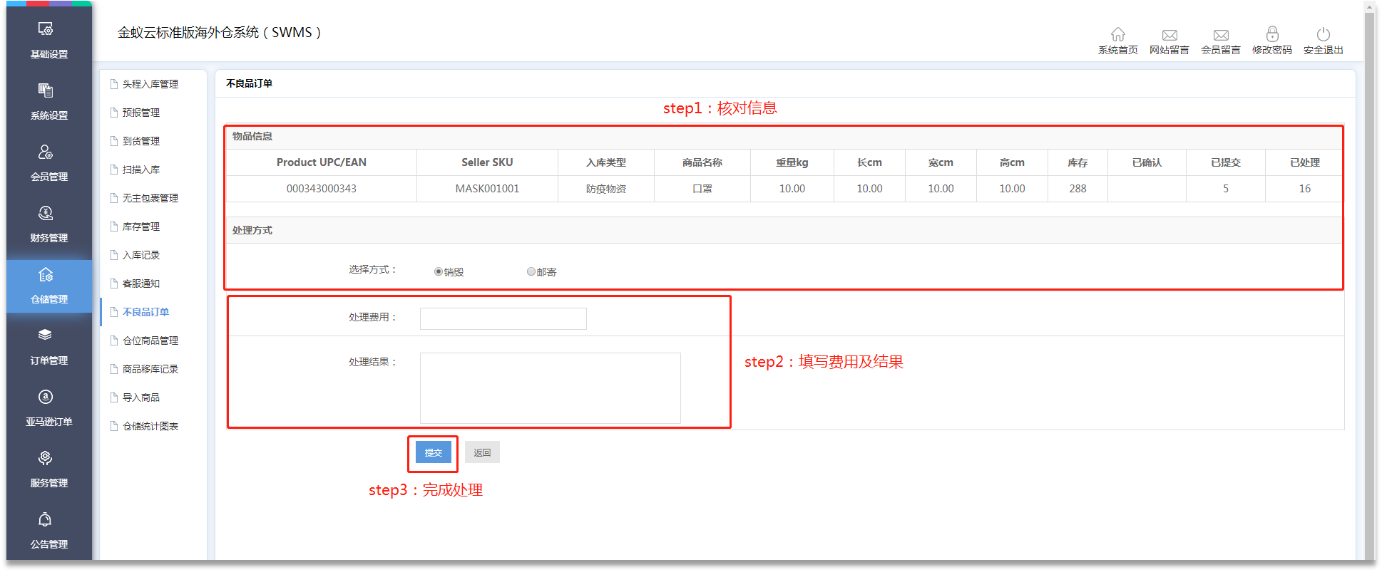 ·會員提交不良品處理訂單后,管理員需前往【倉儲管理】-【不良品訂單】頁面點擊【操作】,根據會員需求操作銷毀/寄回。