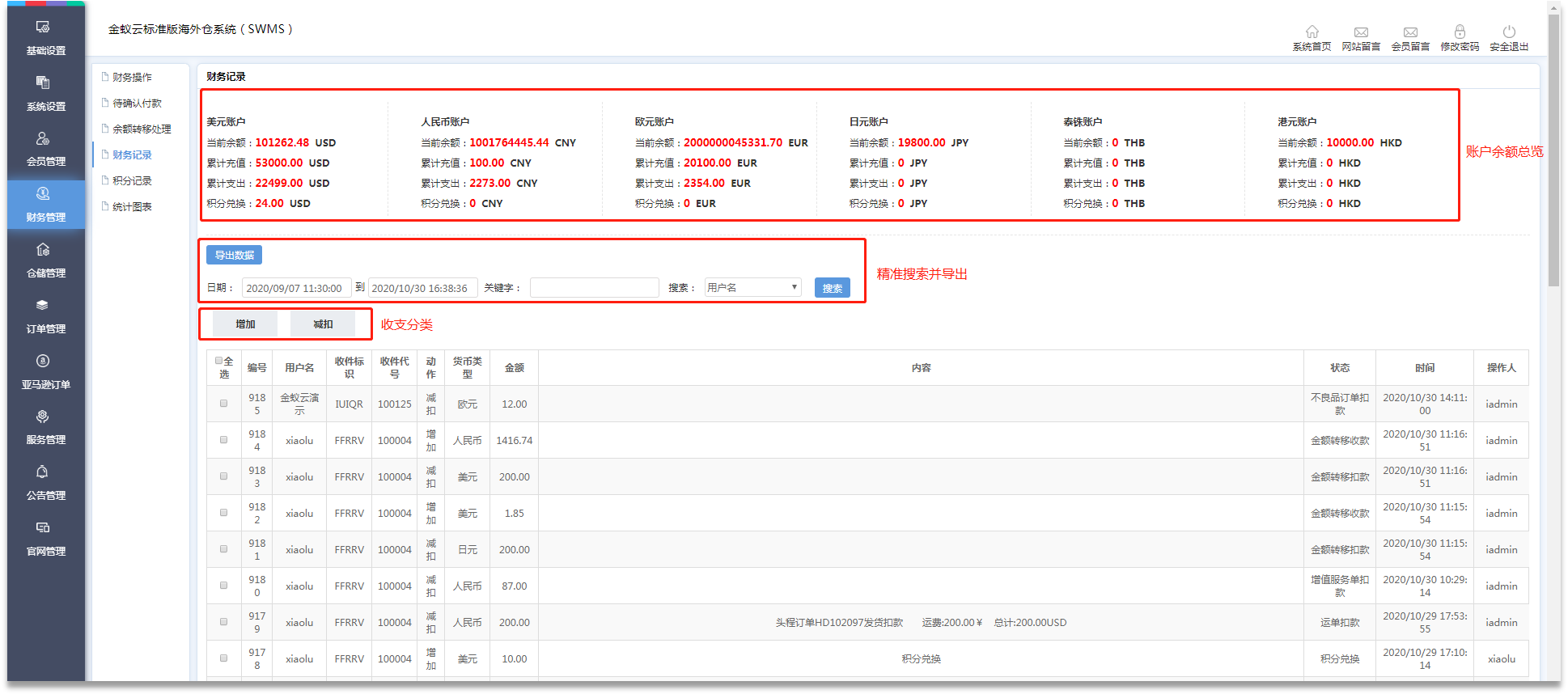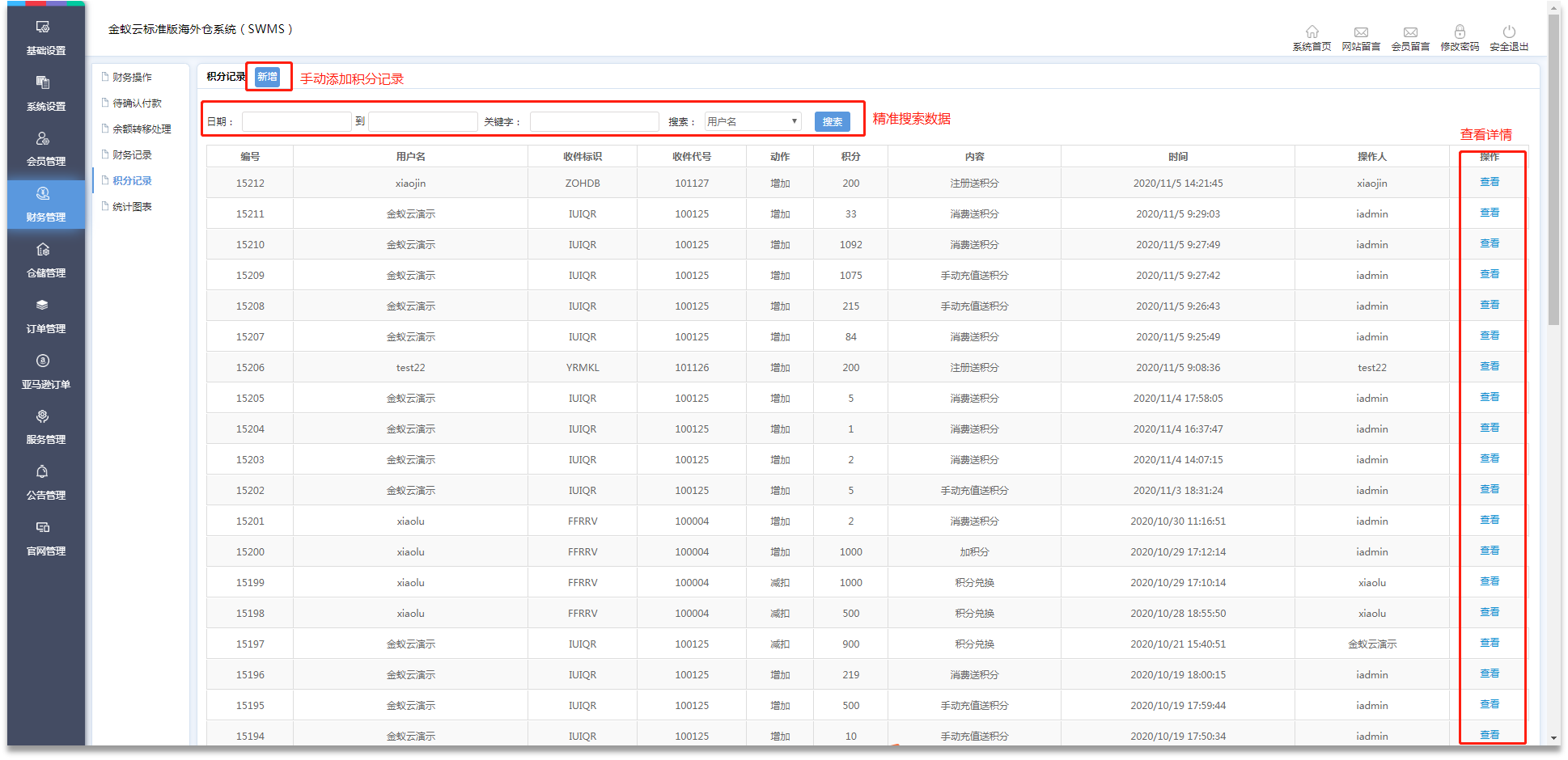 ·對于會員積分及財(cái)務(wù)操作,系統(tǒng)自動記錄并存生成數(shù)據(jù),管理員可在【財(cái)務(wù)管理】-【財(cái)務(wù)記錄】/【積分記錄】中查看。